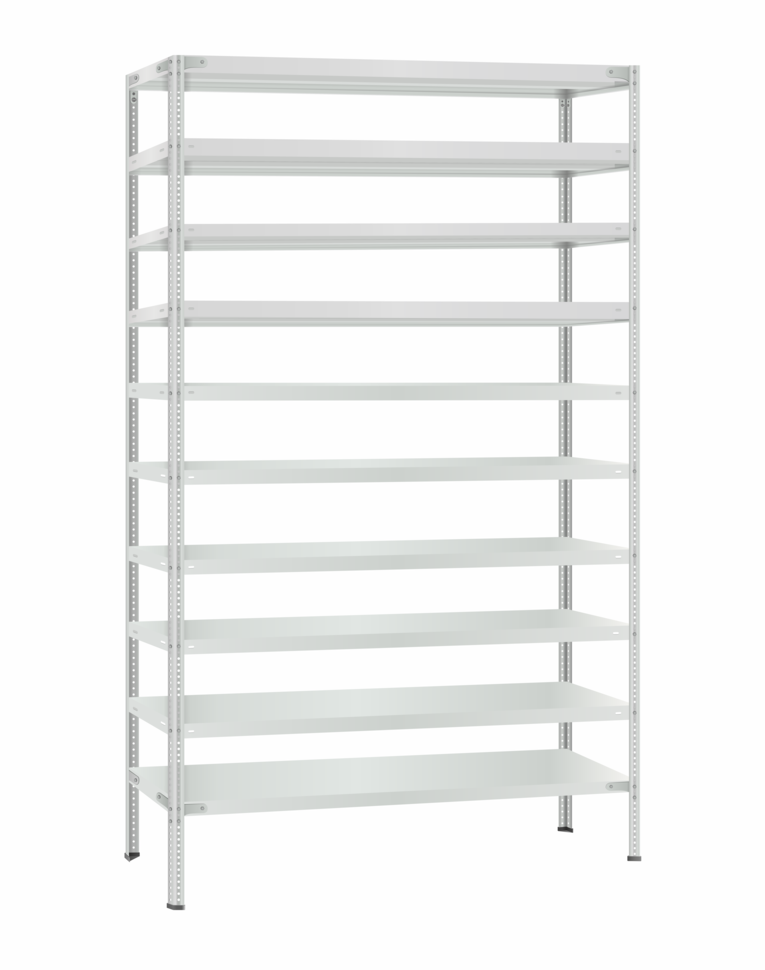 Полки МС Титан изготовлены из высокопрочной стали, покрыта полимерным порошковым покрытием светло серого цвета RAL 7035 типа шагрень