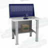 Верстак слесарный металлический с полкой и перфорированным экраном для хранения инструмента.